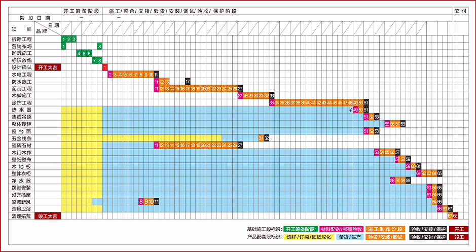 昌禾裝飾結(jié)合多年施工實踐,精心研發(fā)先進(jìn)、穩(wěn)定、標(biāo)準(zhǔn)的魯班工藝施工體系,從開工籌備到竣工驗收,實行嚴(yán)格的節(jié)點控制,保證施工周期統(tǒng)一按標(biāo)準(zhǔn)推進(jìn),實現(xiàn)主材安裝的預(yù)排和分級管理,工序步步緊扣,全面確保家裝工程工期及質(zhì)量。